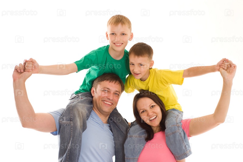 Счастливая семья из четырех человек на белом фоне