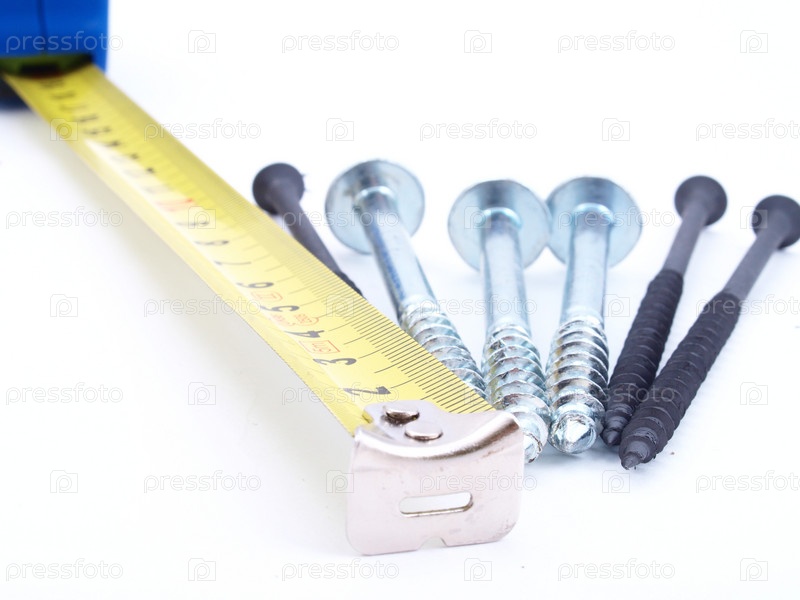 Рулетка и шурупы на белом фоне крупным планом