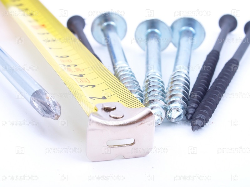Рулетка, отвертка и шурупы на белом фоне крупным планом