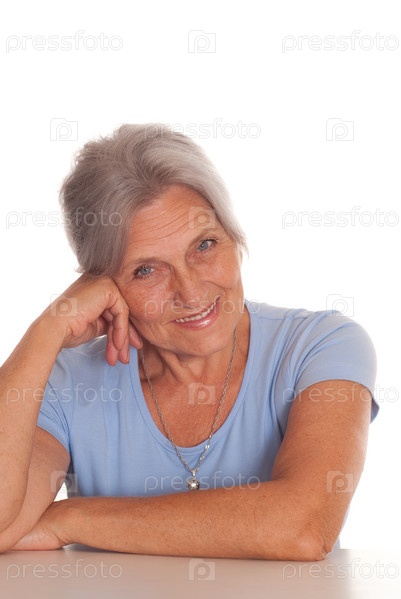 Красивая пожилая женщина в голубой футболке на белом фоне
