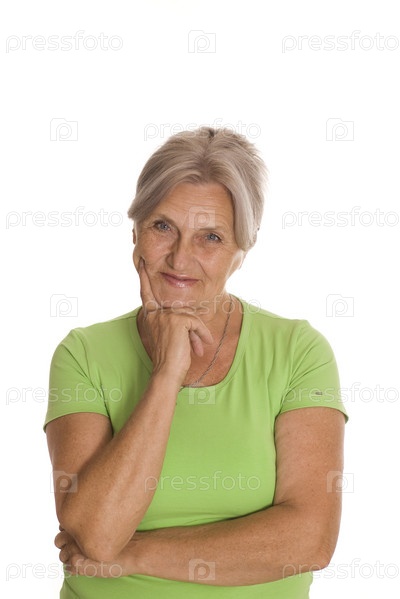 Красивая пожилая женщина в зеленой футболке на белом фоне