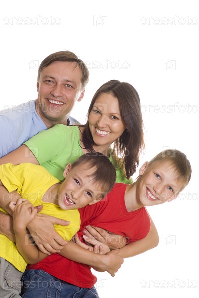 Счастливая и дружная семья на белом фоне