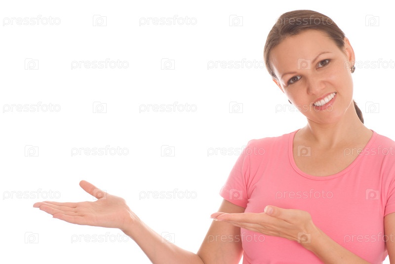 Красивая молодая женщина держит руки ладонями вверх на белом фоне