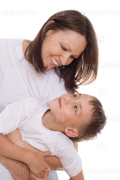 Красивая молодая женщина с сыном на белом фоне