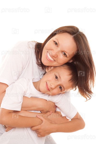 Красивая молодая женщина с сыном на белом фоне