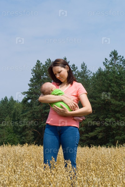 Красивая молодая женщина с ребенком в поле