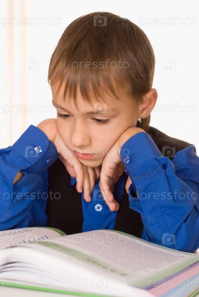 Мальчик в синей рубашке читает книгу на белом фоне