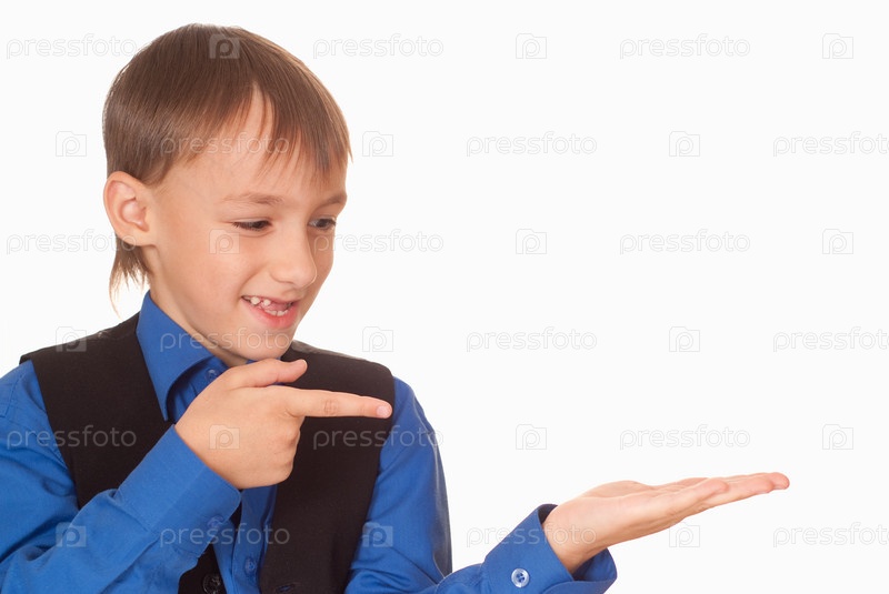 Мальчик в синей рубашке показывает на свою руку на белом фоне