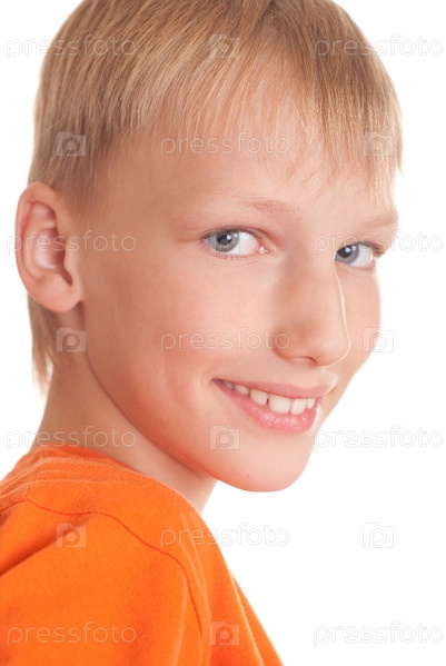 Улыбающийся мальчик в оранжевой футболке на белом фоне