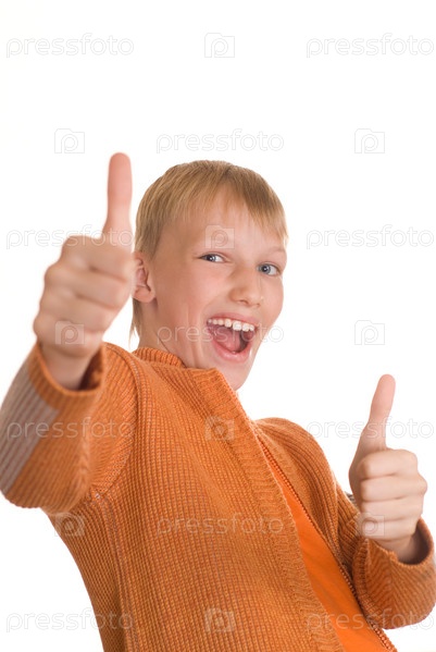 Улыбающийся мальчик показывает большие пальцы на белом фоне