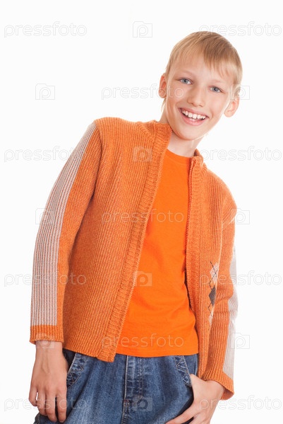 Улыбающийся мальчик в оранжевой кофте на белом фоне