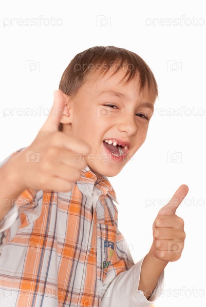 Улыбающийся мальчик показывает большие пальцы на белом фоне