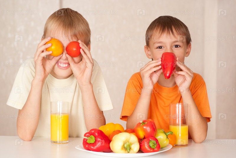 Братья с овощами и фруктами