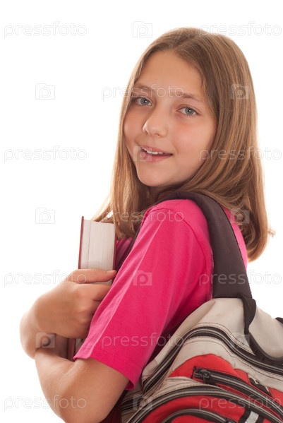Девочка с книгой и портфелем на белом фоне