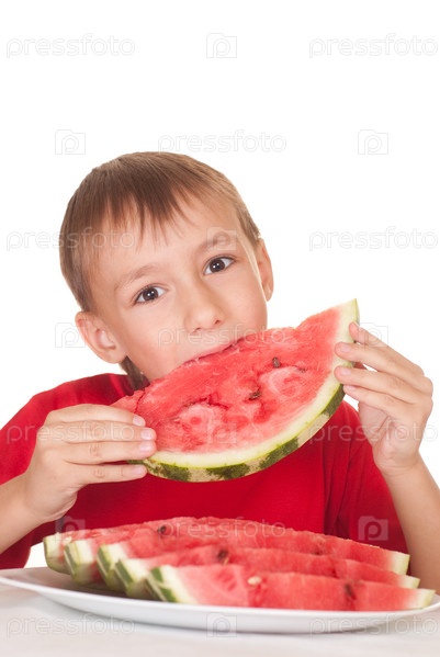 Мальчик ест арбуз на белом фоне