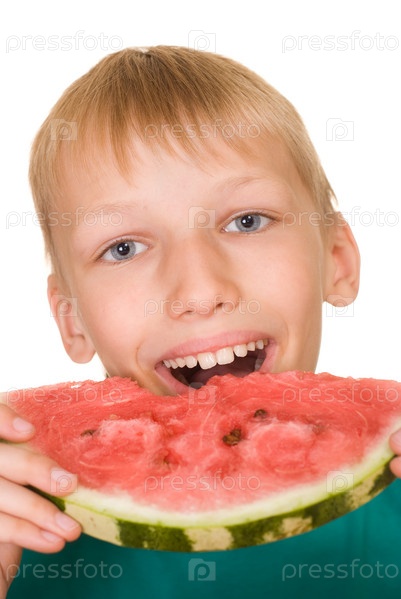 Мальчик ест арбуз на белом фоне