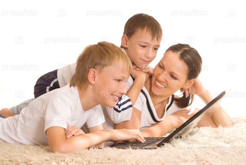 Мама с сыновьями лежат на ковре с ноутбуком