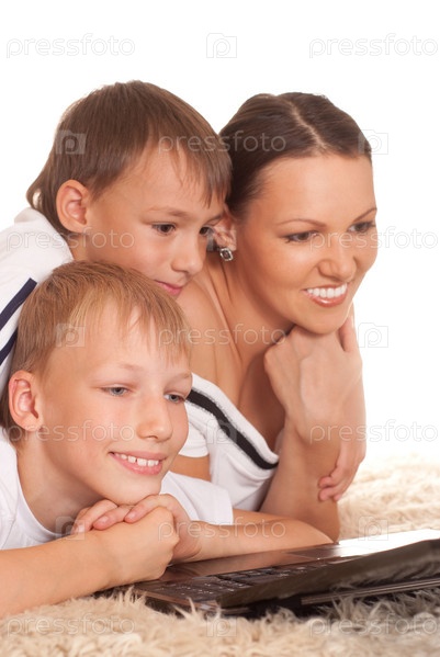Мама с сыновьями лежат на ковре с ноутбуком
