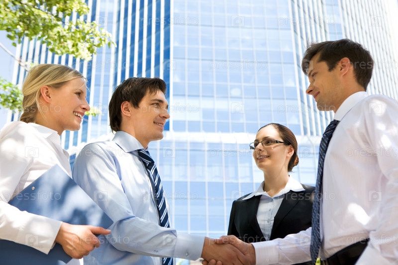 Фото успешных партнеров, обменивающихся рукопожатием после заключения сделки на встрече