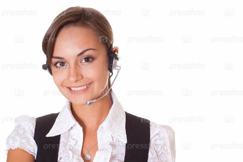 Красивая молодая бизнес-леди с гарнитурой на белом фоне
