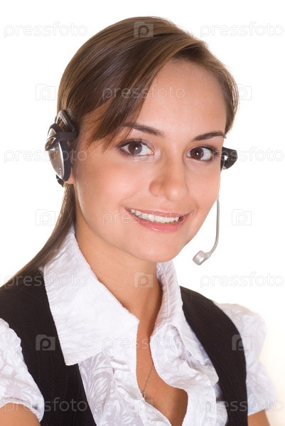 Красивая молодая бизнес-леди с гарнитурой на белом фоне