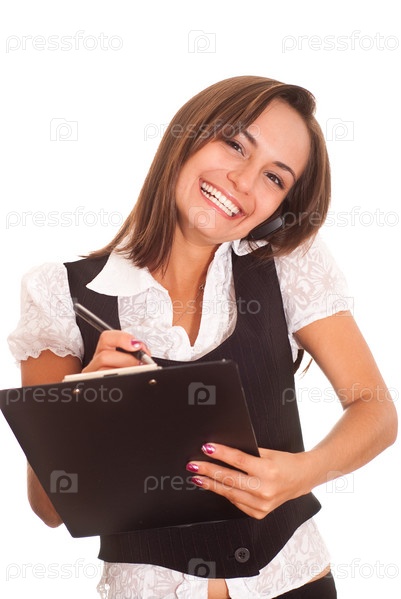 Красивая молодая бизнес-леди с телефоном на белом фоне