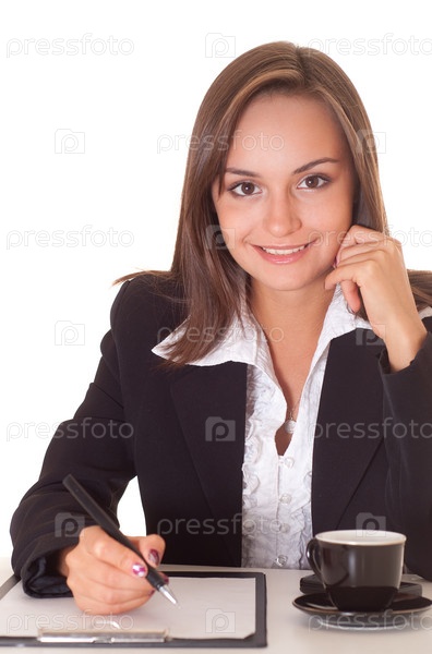 Красивая молодая бизнес-леди с чашкой кофе на белом фоне