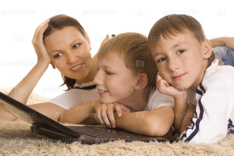Мама с сыновьями на ковре с ноутбуком