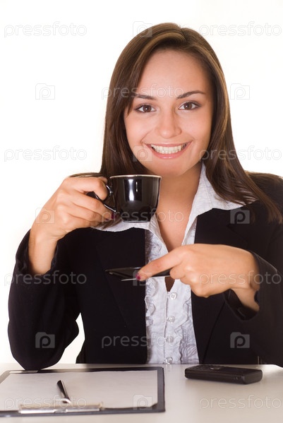 Красивая молодая бизнес-леди с чашкой кофе на белом фоне