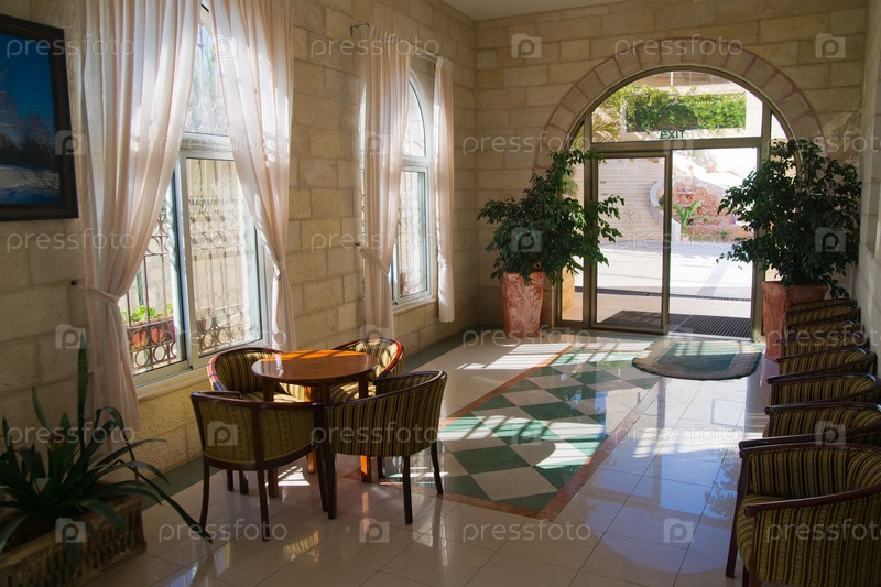 Лобби отеля класса люкс с креслами возле входной двери