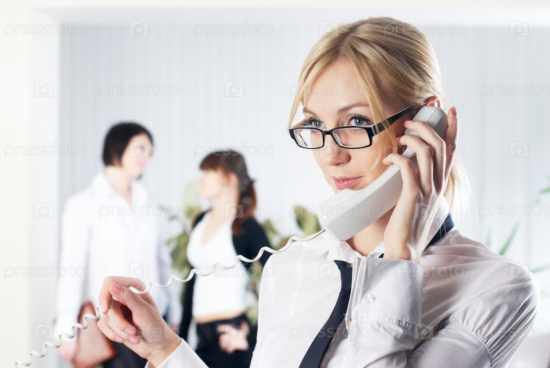 Молодая девушка-предприниматель звонит по телефону в офисе