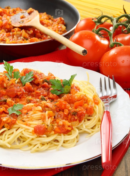 Спагетти с соусом и спелые помидоры на деревянном столе