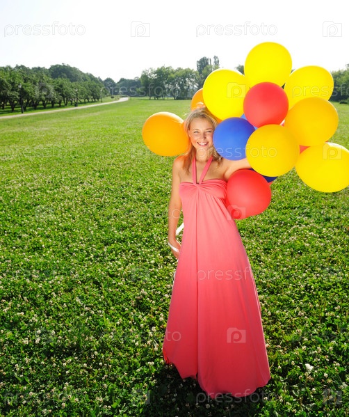 Красивая девушка в розовом платье держит разноцветные надувные шарике в руке
