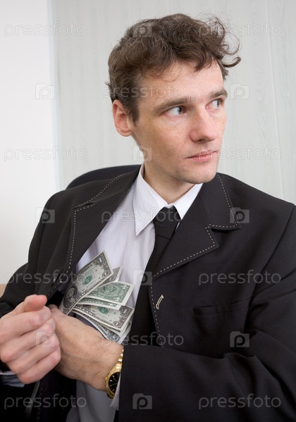 Мужчина в костюме прячет деньги на грудь, оглядываясь вокруг