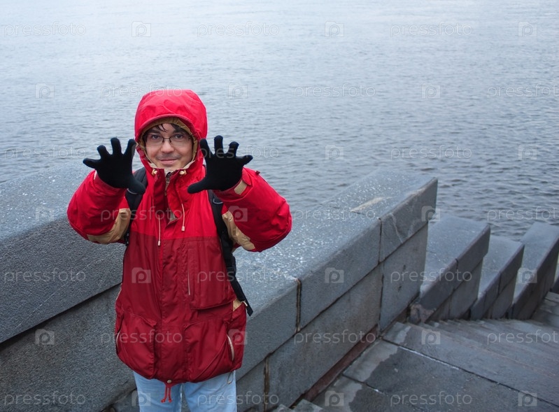Человек с протянутыми руками на набережной реки