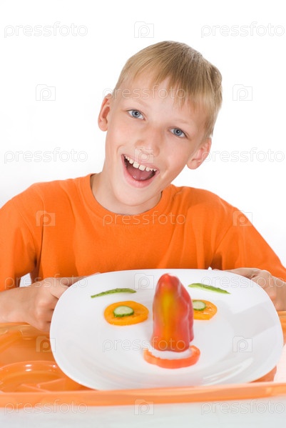 Улыбающийся мальчик с овощами на тарелке