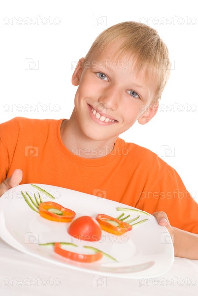 Улыбающийся мальчик с овощами на тарелке
