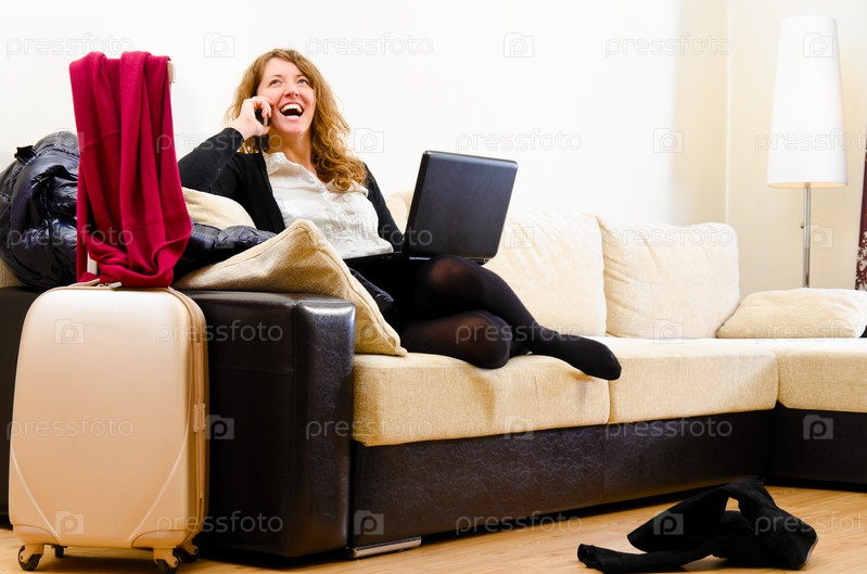 Деловая женщина сидит на диване в гостиничном номере и разговаривает по телефону