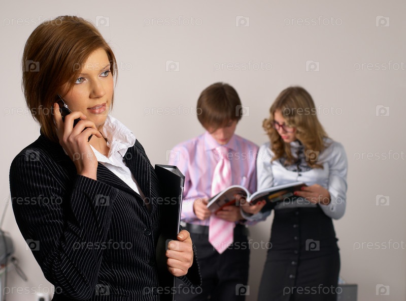 Молодая девушка-предприниматель звонит по телефону в офисе