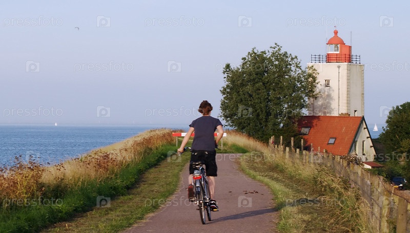 Человек едет на велосипеде по дороге к маяку