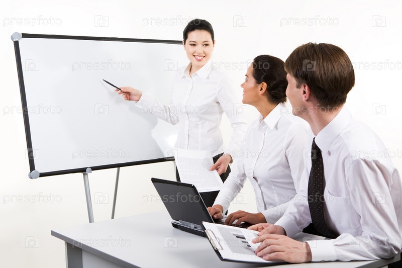 Фото уверенных в себе партнеров, слушающих успешную бизнесвумену, читающую им лекцию во время обучения