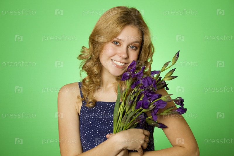 Портрет улыбающейся девушки с букетом ирисов