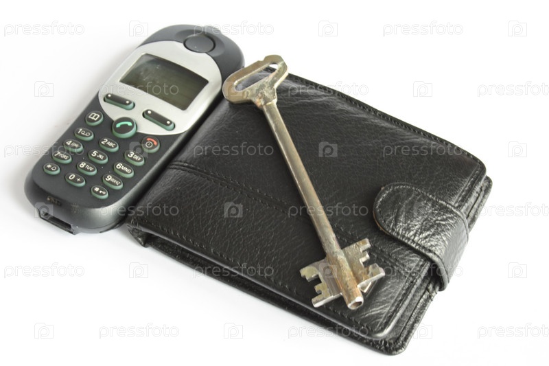 Черный кошелек, ключ и мобильный телефон