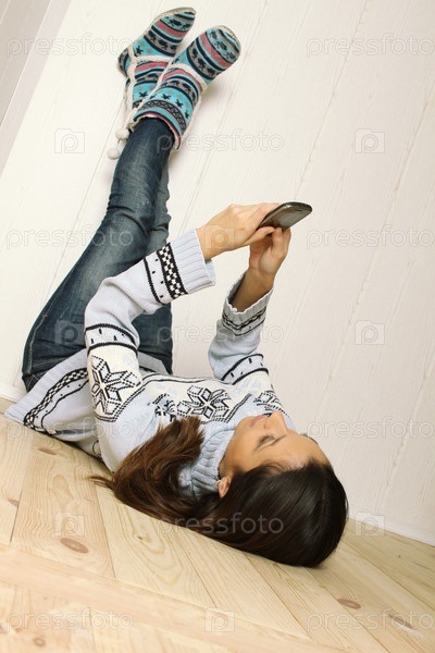 Молодая девушка лежит на полу с мобильным телефоном