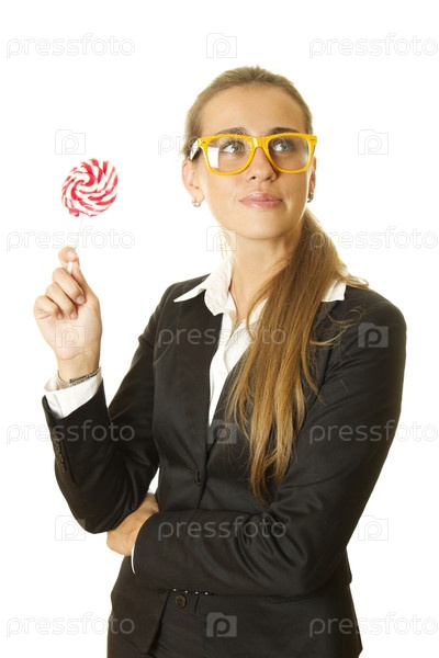 Молодая бизнес-леди с леденцом, на белом фоне
