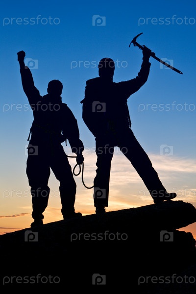 Два путешественника достигли вершины на фоне заката