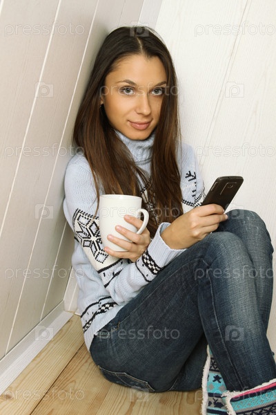 Привлекательная молодая женщина у себя дома в теплом свитере с мобильным телефоном и чашкой кофе
