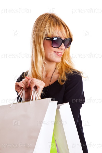 Счастливая девушка с сумками для покупок, изолированная на белом фоне