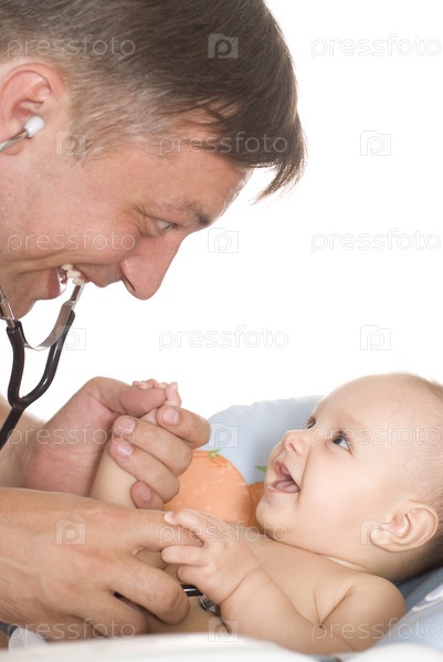 Доктор слушает новорожденного на белом фоне