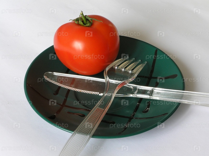 Красный помидор и пластиковые вилка и нож на тарелке на столе
